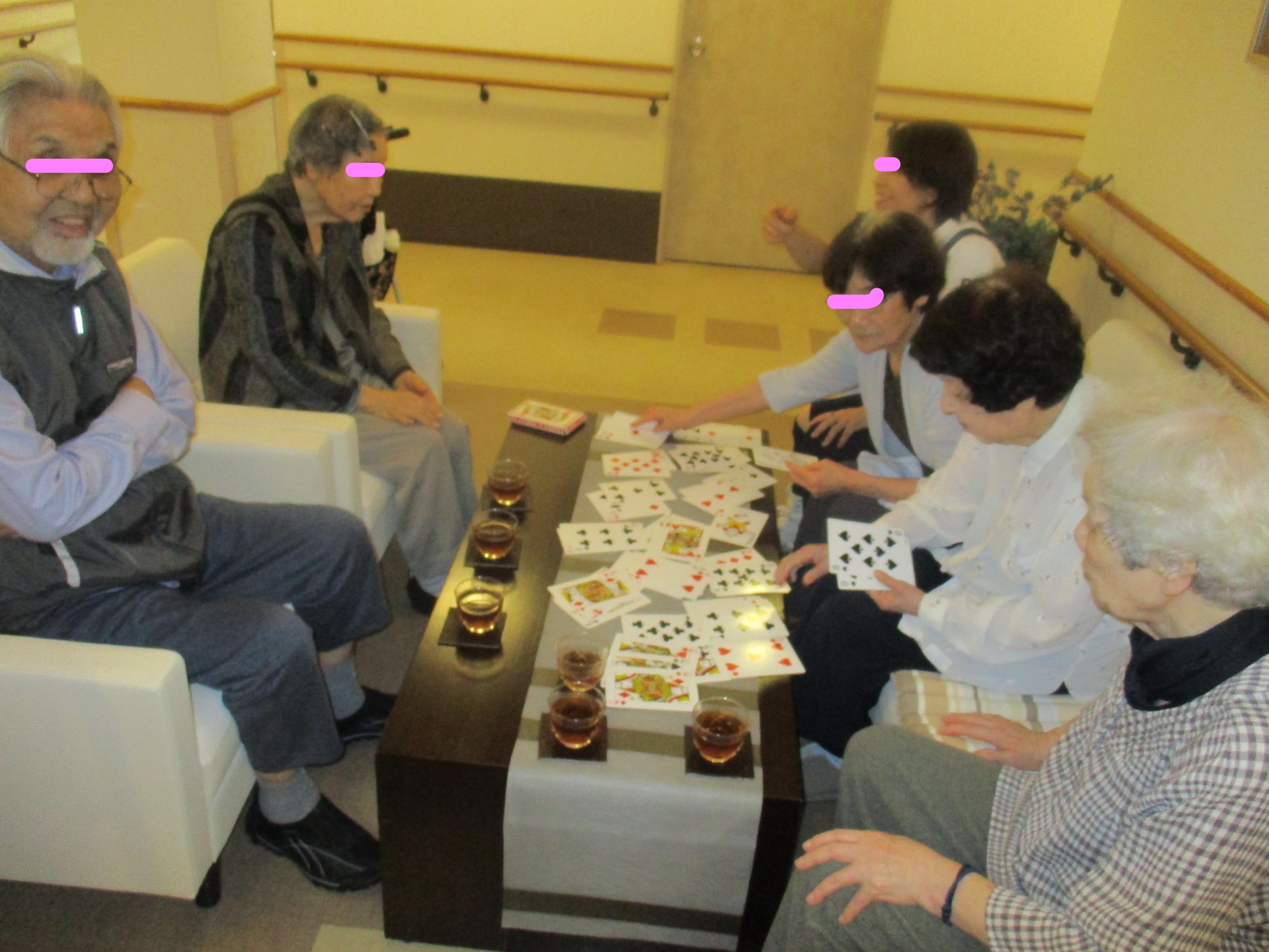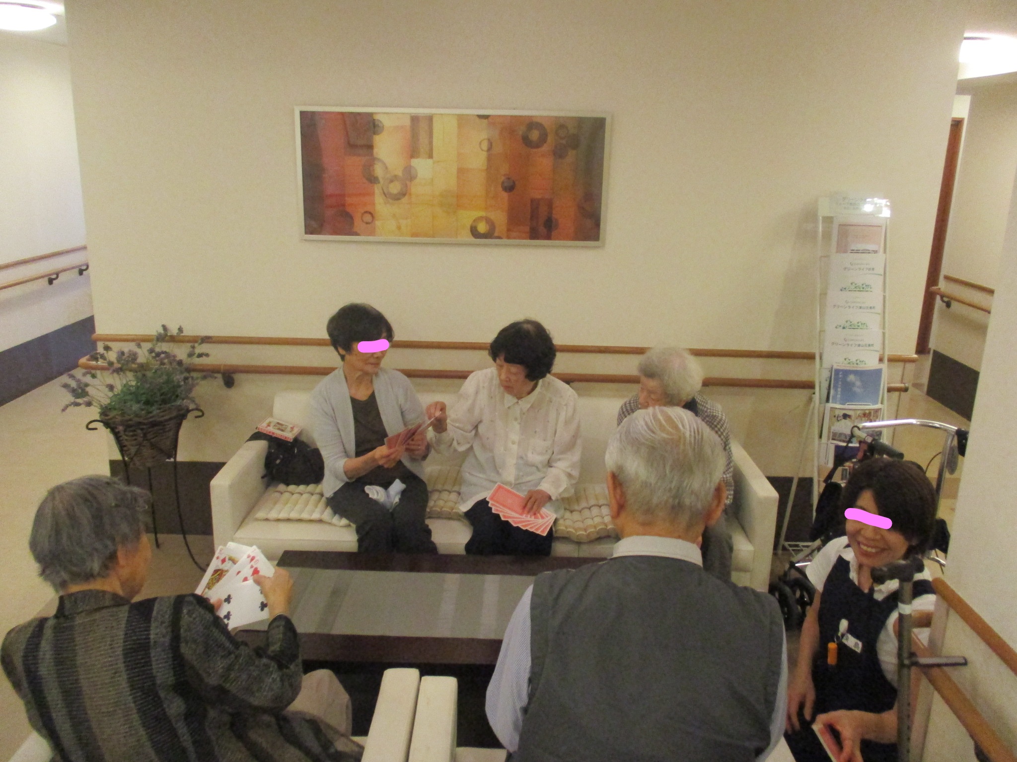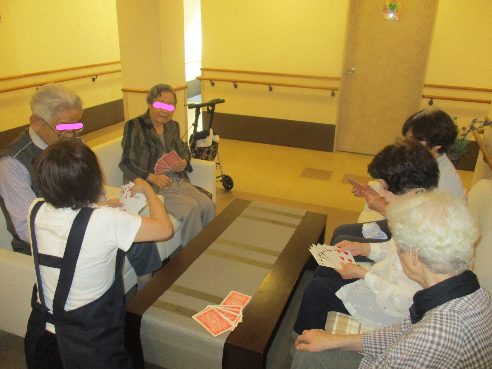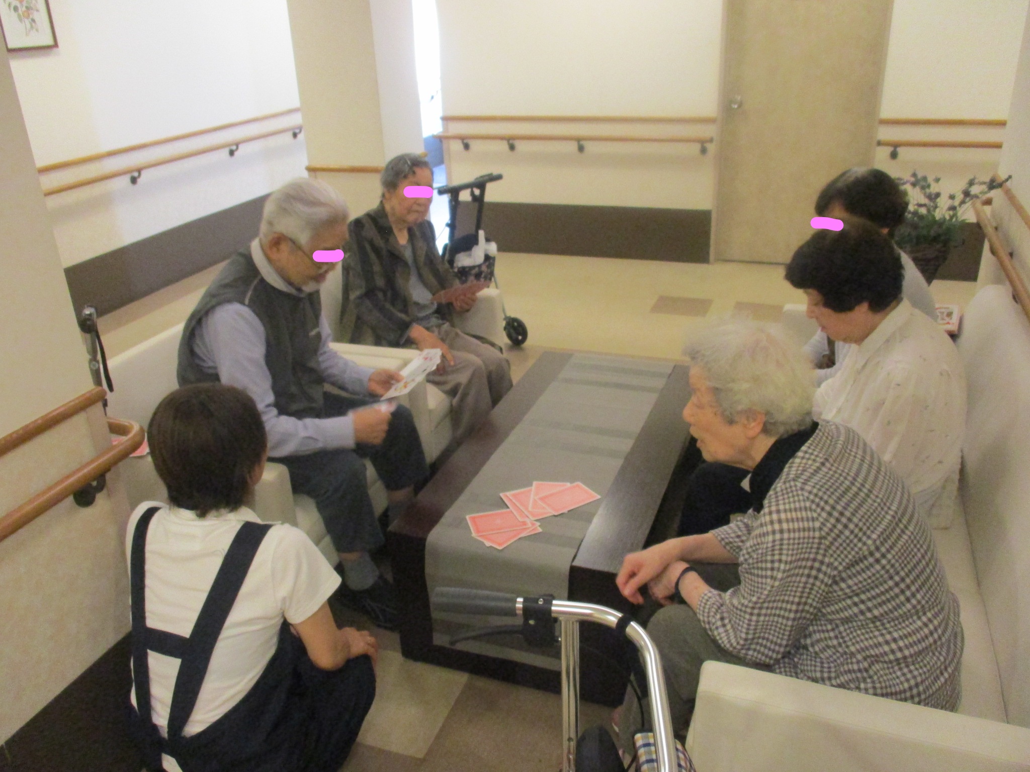 午後のひととき、楽しそうな笑い声がフロアに響いてきたので何事かと様子を見に行くと、談話スペースで百人一首を皆で楽しまれていました。