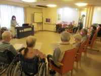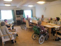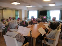 外部から先生が来て下さり、ウォーミングアップの体操、歌詞の朗読、そして歌を歌うという流れ。季節ネタなどの話を盛り込んで下さるので、実は頭も使うんです。なので「脳トレ」とういう言い方もしています。