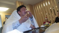 そばやプリン、シュークリームを食べるのですが、うまく口に入る時もあれば、後ろから悪意のあるパフォーマンスなんてされた日には顔中デロンデロンです。(笑)