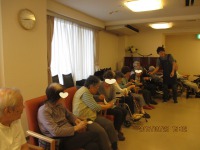 2チームに分かれて対決です!ピンポンリレーは、おたまにピンポンを乗せてお隣に移していきます。先に列の一番端の選手にまでピンポンを移し終えたチームが勝利!筒通しは、長く伸ばしたロープに端から筒を通していき、全ての筒を先に列の端まで渡し終えた方が勝利!チームワークが重要です(^-^*)お隣の方に声援を送ったり、手助けしたり…歓声が飛び交いました!座ったままでも楽しく汗をかき(?)スポーツの秋を感じていただきました♪