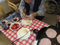 ご利用者様方にもお手伝い頂いて、みんなで作ったイチゴ入りさくらもちをみんなで美味しくいただきました。
