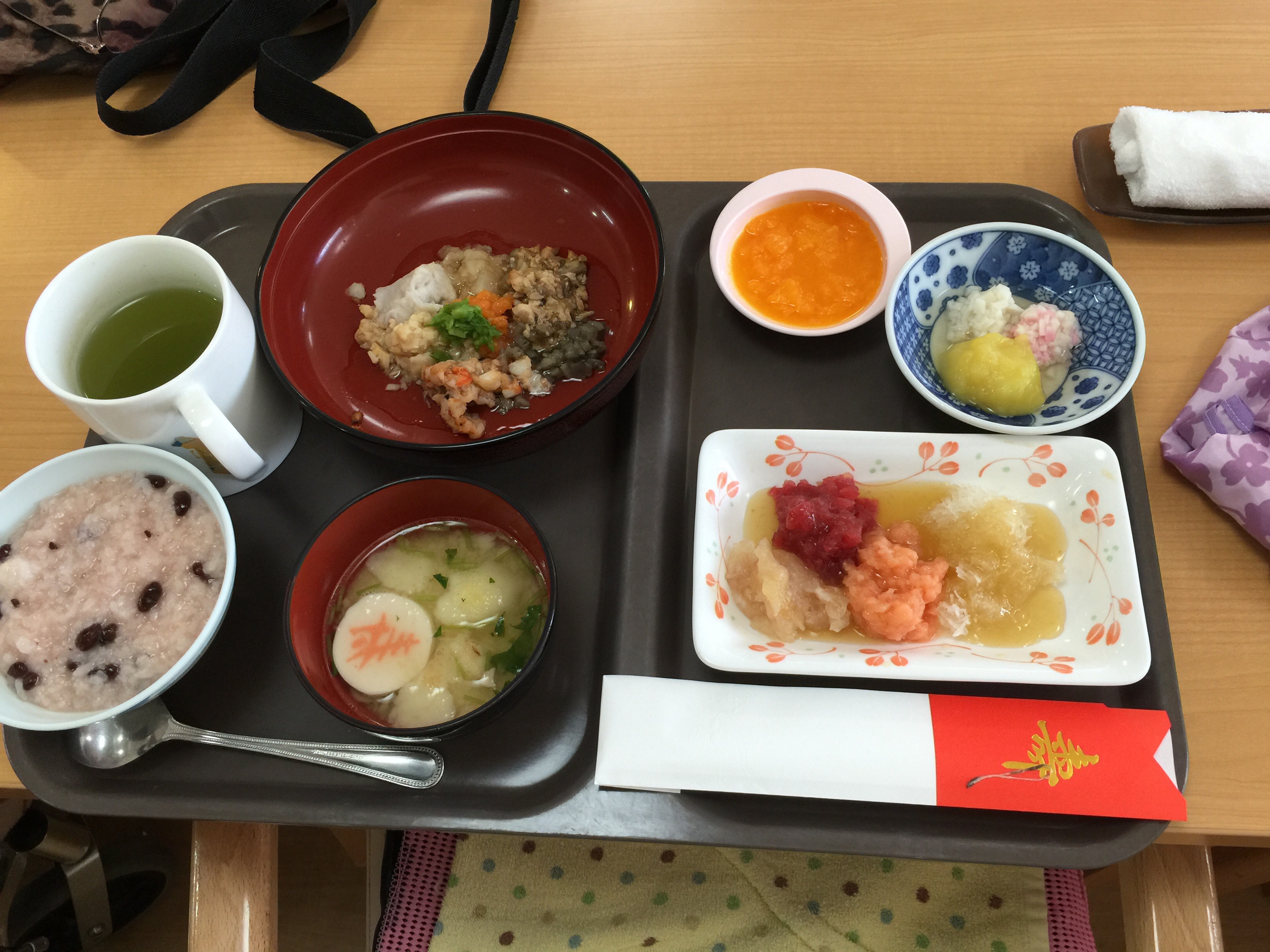 お赤飯、お刺身、おせち盛り合わせ、煮しめ、すまし汁、ミカンでした。