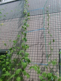 はぴね横浜のグリーンカーテン、5月末の報告より1か月半、葉なども生い茂り、長いものは2階まで届くくらいに成長しました。まだまだ伸びて、楽しませてくれるものと期待しています