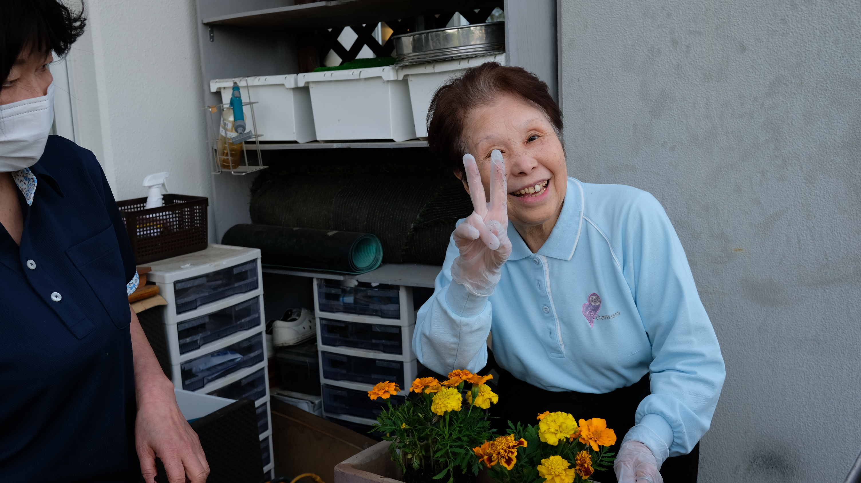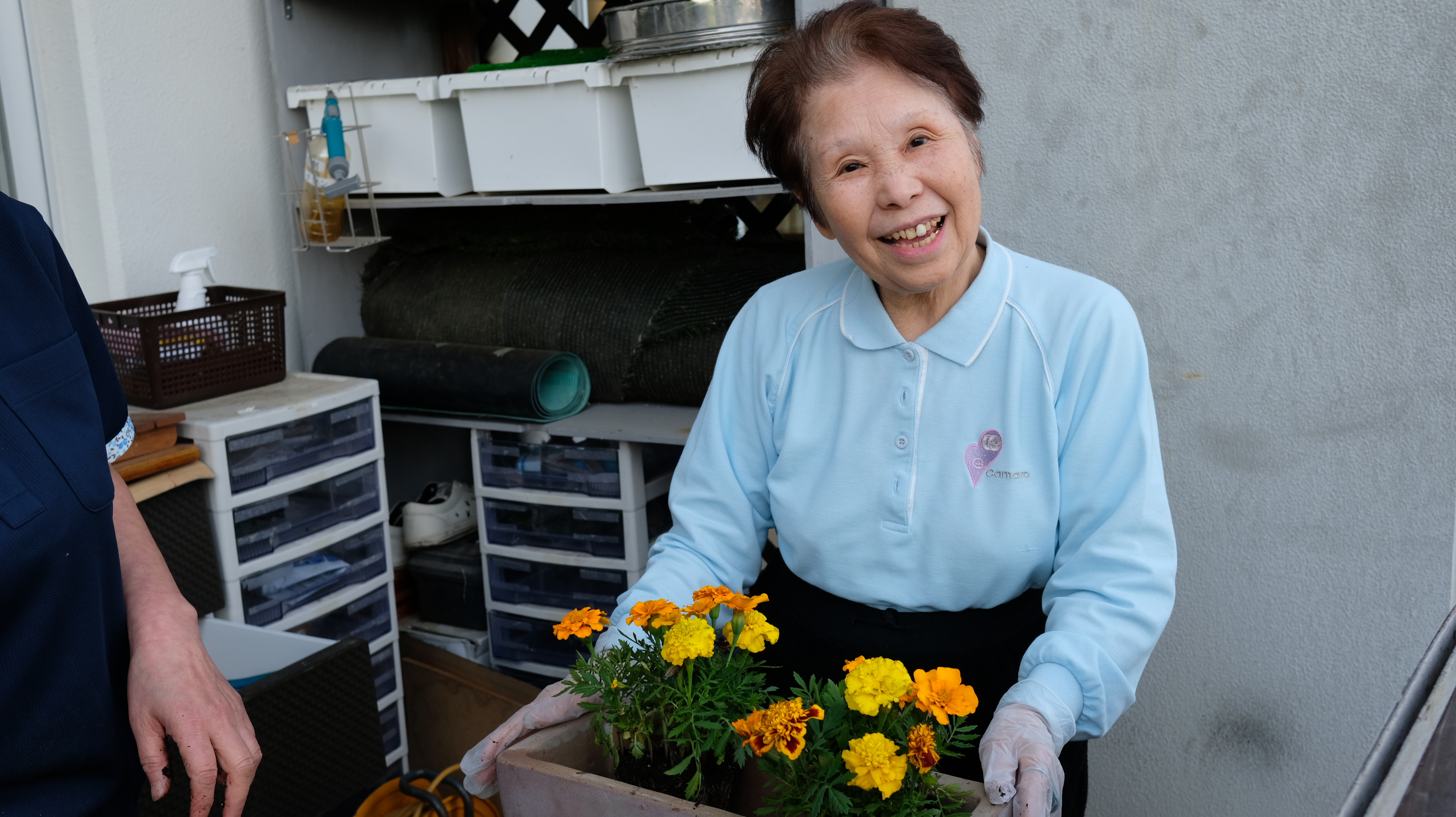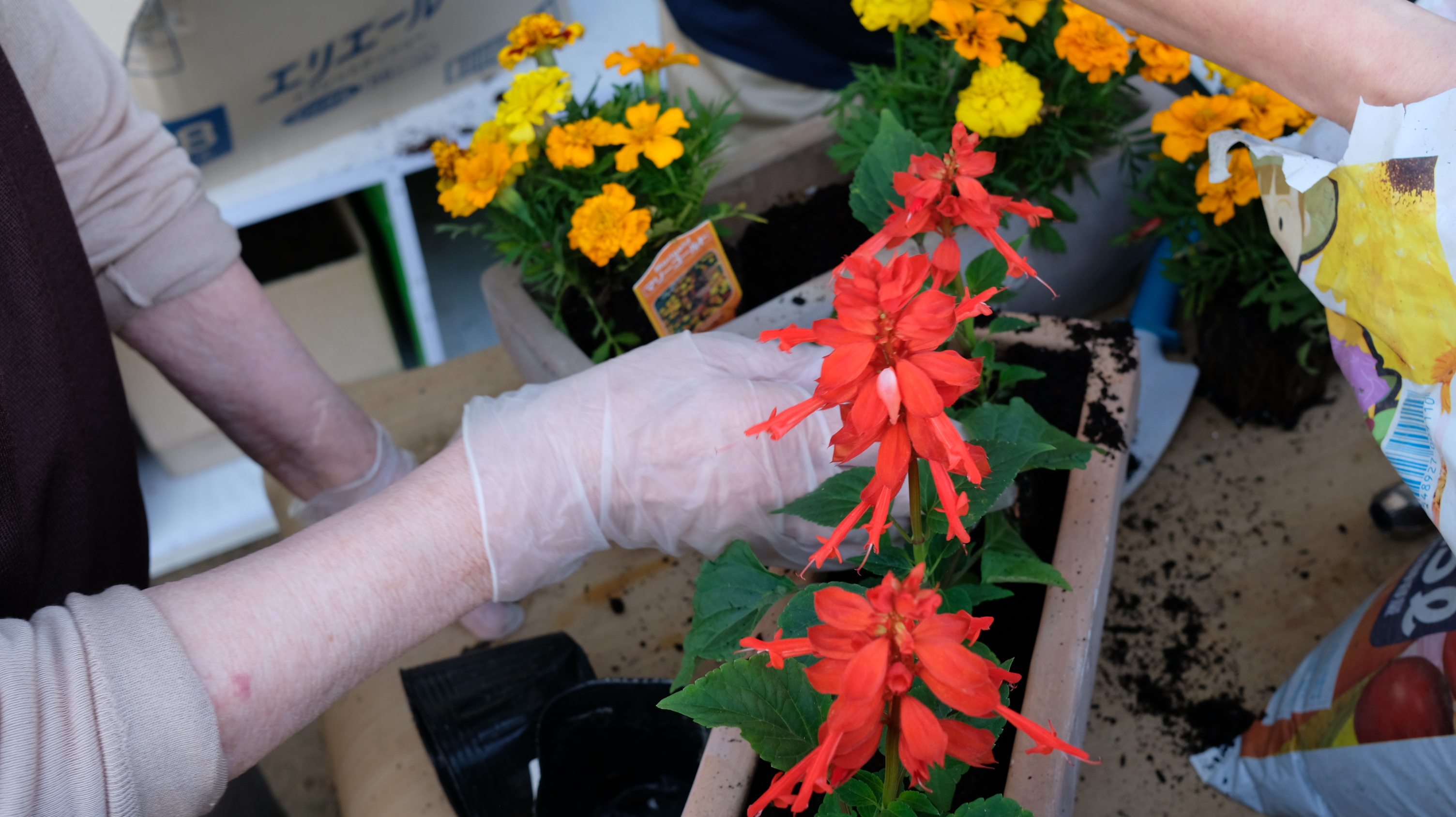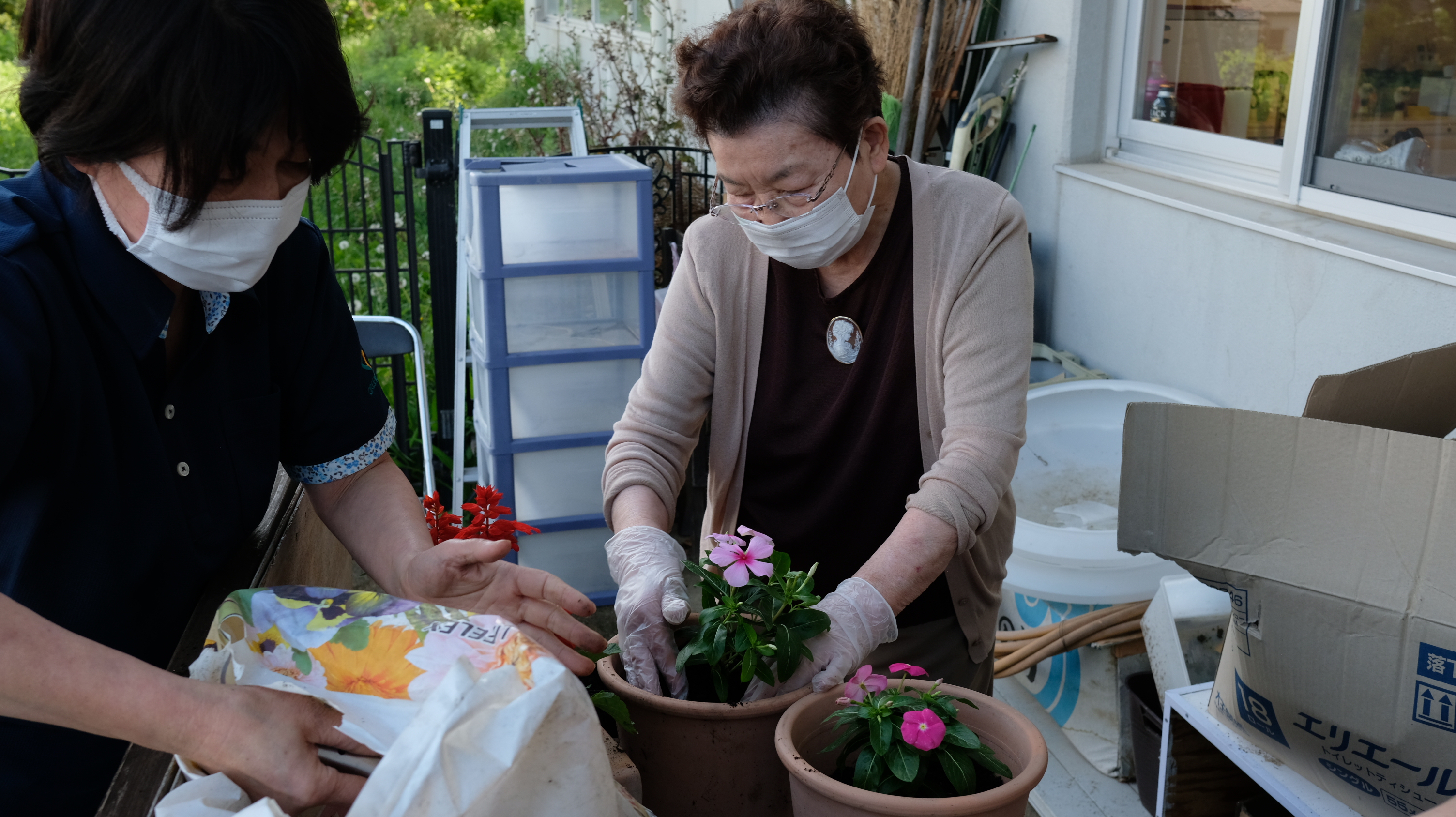 心地よい風を感じながら、入居者様と一緒に花の鉢植えを行いました。