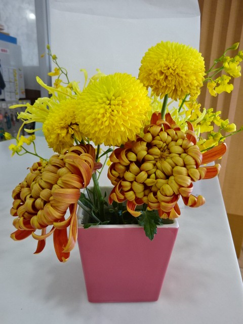 お正月飾りの玄関の花達も黄色の花だけ小さく