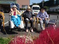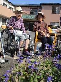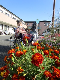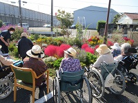 終了後は入居者様やスタッフと楽しそうにお話をされたり、花壇のお花を眺めたりされていました。