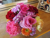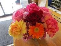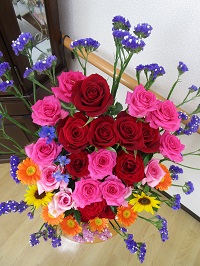 小さい方はピンク系で可愛らしいアレンジメントに、大きい方はカラフルで見ていると元気が出るようなアレンジメントになっています。