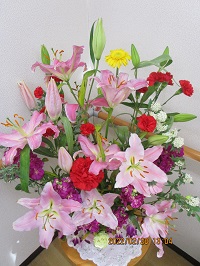 応接室に飾られているフラワーアレンジメントの百合が咲きました!