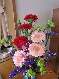 ピンク色のガーベラや赤や黄緑のカーネーションで華やかなアレンジメントになっています。