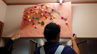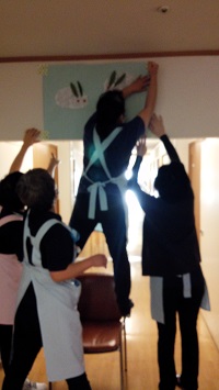 廊下の上の仕切りに手作りのお正月の飾りつけをみんなで力を合わせて・・・