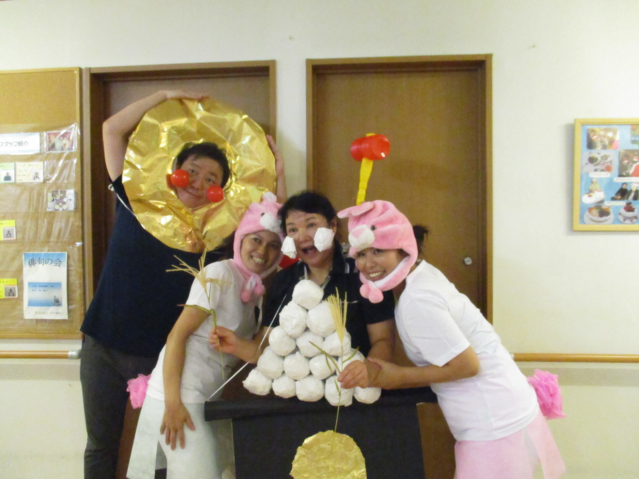 お月様、うさぎさん、杵とお餅つき、お月見団子とスタッフが
