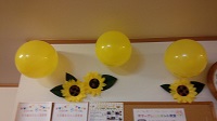 伝言板にはひまわりの花と一緒の黄色の風船を飾って