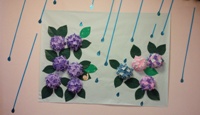プラスチックの小さめのカップを裏返して花びらを飾り花芯に綿棒をみたて手作りで立体的に仕上げました。