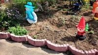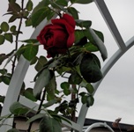 5月にも咲いた赤いミニバラが咲いてバラのアーチにも赤い大きなバラが咲いています。