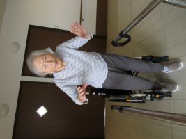 個別リハビリで歩行練習中ですね(^^♪ 両手を話してポーズまでしてくれています。転ばないように注意しましょう!