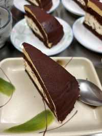 本日のおやつはチョコレートケーキです(^^♪ 美味しそうですね。お洋服にチョコレートがつかないように気をつけて召し上がって下さい。