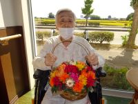 玄関のお花が変わると「これも素敵ね~」と笑顔です。「写真も撮って」とお花を抱えて撮影です(^^♪