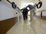 手すりにつかまってしっかり足が伸ばせてますね。入居者様もいつもと違うリハビリに楽しそうです。