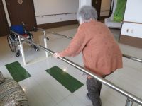 平行棒を使用して歩行練習です。「まだまだだよ~」と言われながらもしっかり歩行出来ていました(^^)