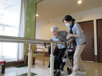 立ち上がりをしっかり! 笑顔でリハビリされています(^^)お話好きなので会話されながら楽しく練習されていました。