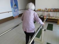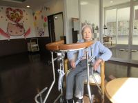 歩行器で玄関ホールまで歩行練習です。玄関ホールで一休みしながら日向ぼっこですね(^^♪また帰りは頑張って歩きましょう!!