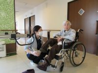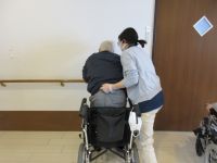 手すりを使って立ち上がり練習を個別で実施しています。窓際で練習すると立ち上がった時に外の景色が見えるので長い時間立ち上がっておられました(^^♪