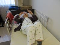 ベット上でリハビリです。最後は寝たままでピース(^^♪コツコツ頑張って動かしましょう。