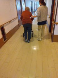 施設内を散歩中。お部屋から玄関まで長い距離をしっかり歩けていますね(^^♪