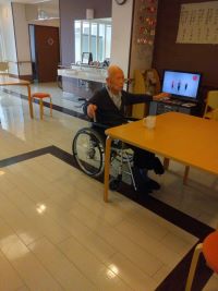 午後ホールにてリハビリ体操です!!手を頑張って結んで開いて、手を上げて・・