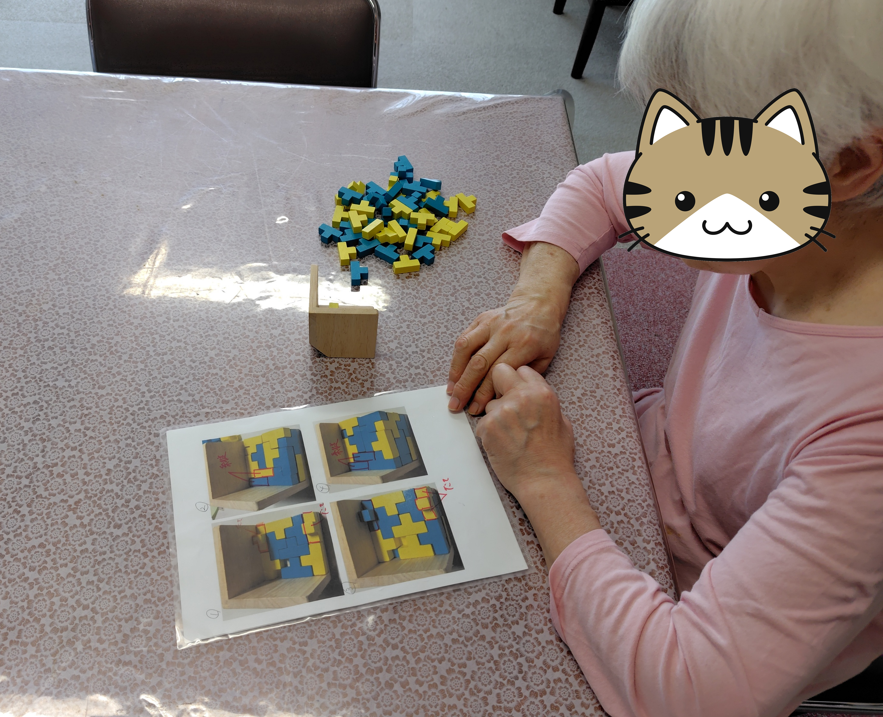 今日は、いつも行われている歩行訓練の他、認知機能の維持・向上としてパズル(?)をやっていました!