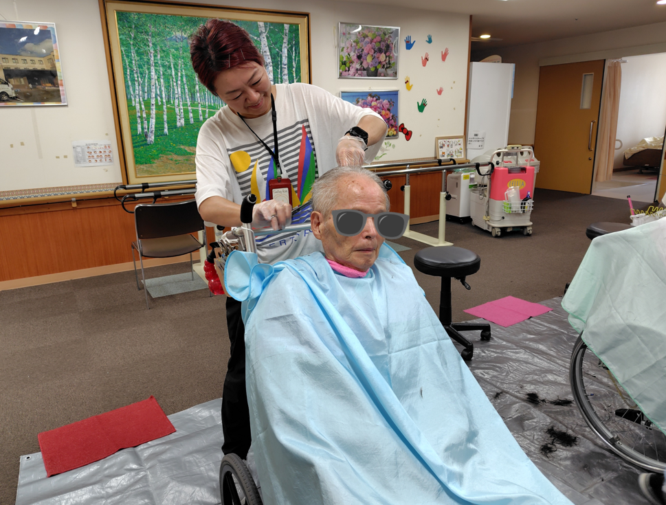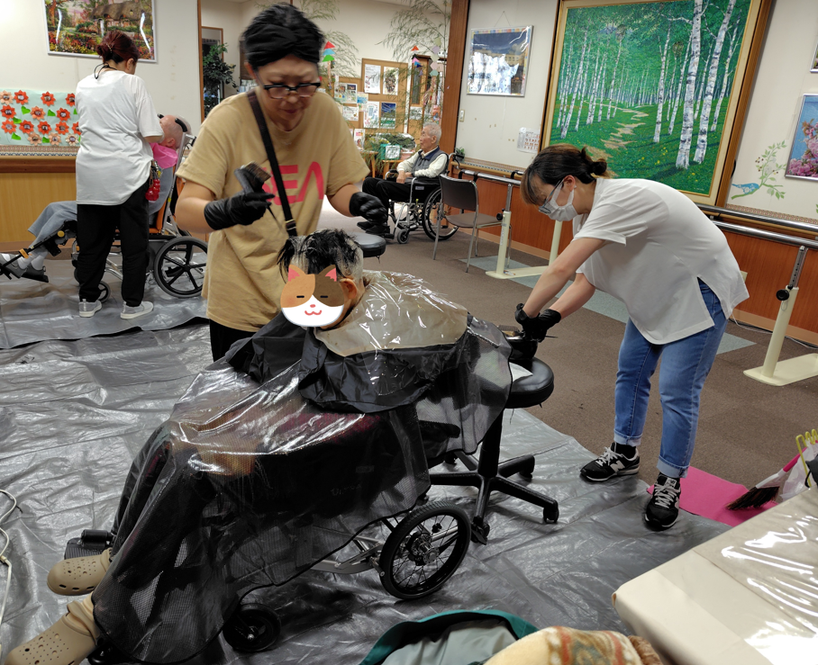 プロの理容師さんが来て毎月施設まで来て散髪や髪染め、そしてパーマなんかも希望すればやってくれます。