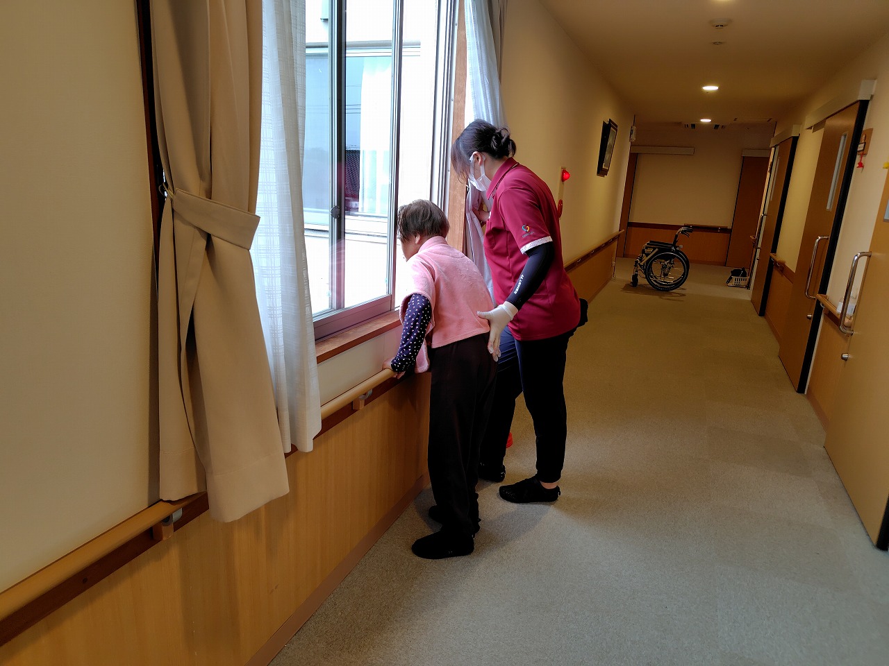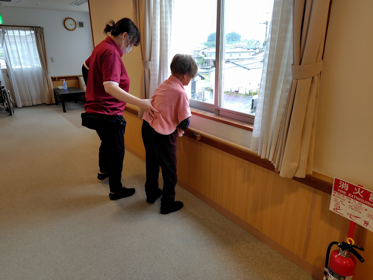 長い廊下をゆっくりとしっかり手すりを使って歩きます。