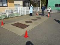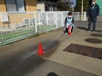 レクチャー用の水消火器を使い、消化器の使い方などを