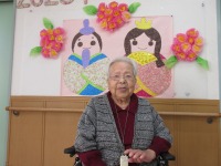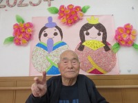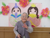 入居者様とスタッフで作ったお雛様の前で記念撮影を行いました。