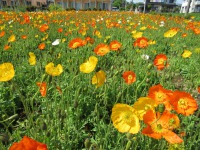 畑一面に咲いたルピナスとポピーは色鮮やかで