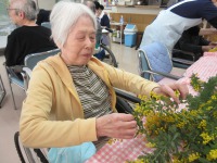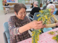 たくさんのミモザを前にどんな形にしようか考えながら