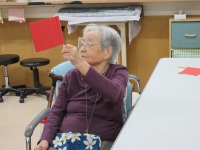 入居者様が真剣な眼差しで両手に紅白の旗を持ち