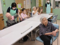 前回新聞紙を丸めて作った棒を持って体操を始めます。
