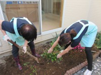 環境整備の一環として中庭の花壇の草むしりと土を耕やかし