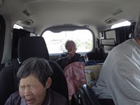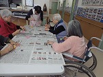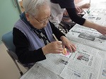 スポンジに絵具を付け桜の型紙の上からポンポンと色つけをして、