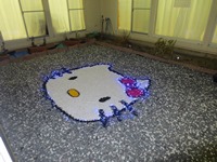 レースのカーテン越しに見えるキティ―ちゃんが幻想的と
