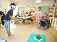 スイカ割です 入居者様では 力が足りず 割れません。職員の一撃でした。