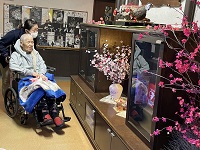 ガラス越し面会をされた入居者様に始まる前や終わった後で玄関の梅飾りをご覧になって頂きました。