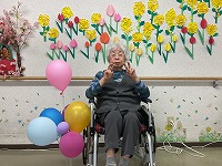 3月の誕生日月の方と一緒に施設内の菜の花畑の壁紙前にて