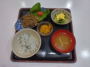 今日は、やさしい味わいの菜飯ご飯に、ほっとする味噌汁、食欲をそそる牛肉の焼肉ソース炒めをご用意しました。副菜には、彩りもきれいなブロッコリーのミモザサラダを添え、デザートにはフルーツもお出ししています。