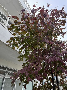 利用者様の部屋から見える桜の葉が少しずつ周りから赤くなり、ホールから見える葉は上から見ると赤みが強くなってきています。