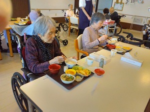 本日の昼食は「竹の子ごはん」「澄まし汁」「天ぷら盛り合わせ」「菜の花のツナわさびマヨ和え」「フルーツ」でした。天ぷらは「海老」「かぼちゃ」「かきあげ」の3種類で入居者様に選んでいただき、一番人気は海老の天ぷらでした♪ 皆様いつもより沢山召し上がっていましたよ。