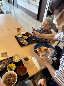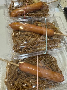 お祭りの時に良くみる、焼きそばやフランクフルト、キュウリの漬物などを昼食でお出ししました。