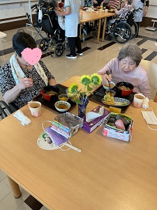 食レクでは暑い日にピッタリのお蕎麦やてんぷらをバイキング形式で、利用者様のご希望で、おかわりなどの形でご提供させていただきました。