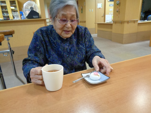 今日のおやつは桜の花で飾られたお饅頭(^^)